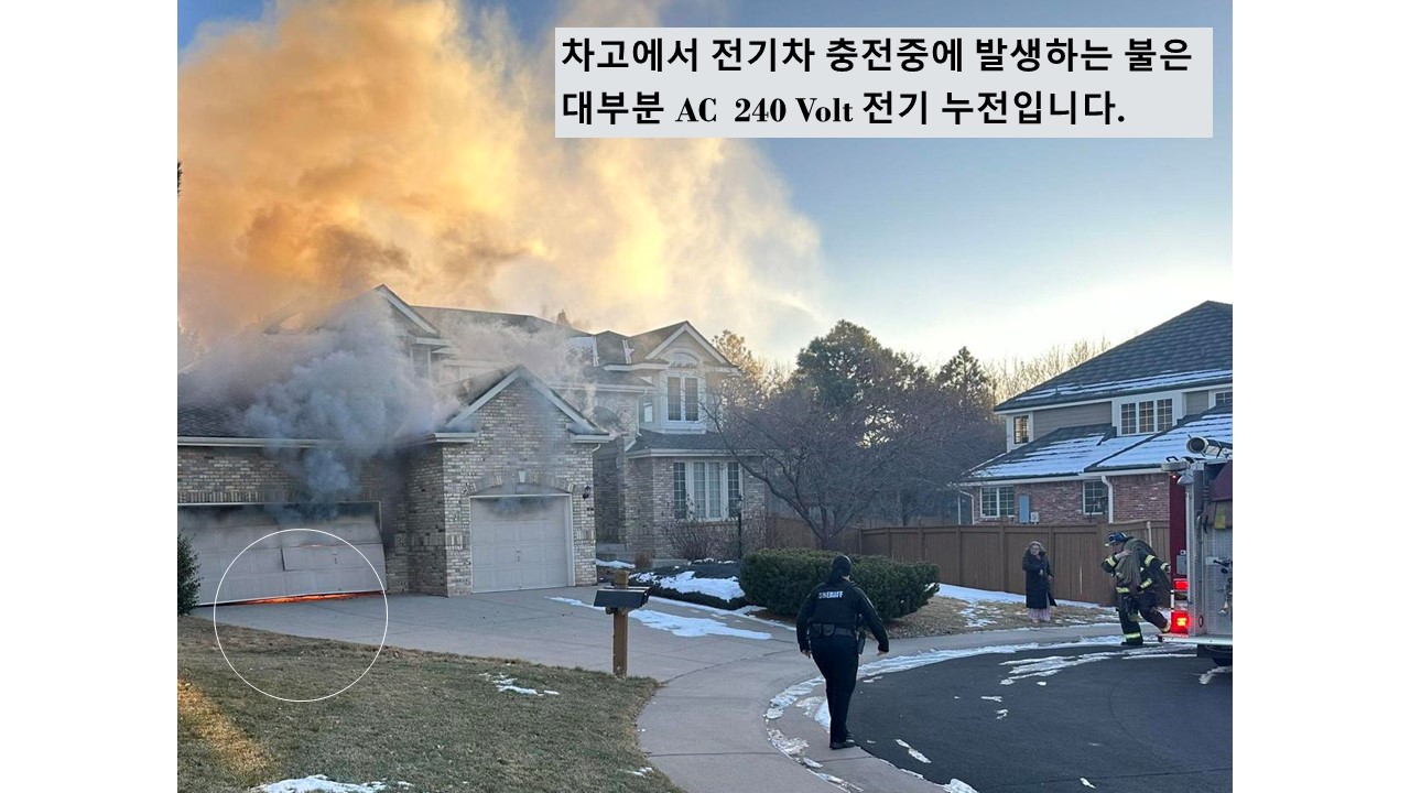 차고에서 전기차 충전중에 발생하는 불은 대부분 AC 240 Volt 전기 관련 화재입니다.